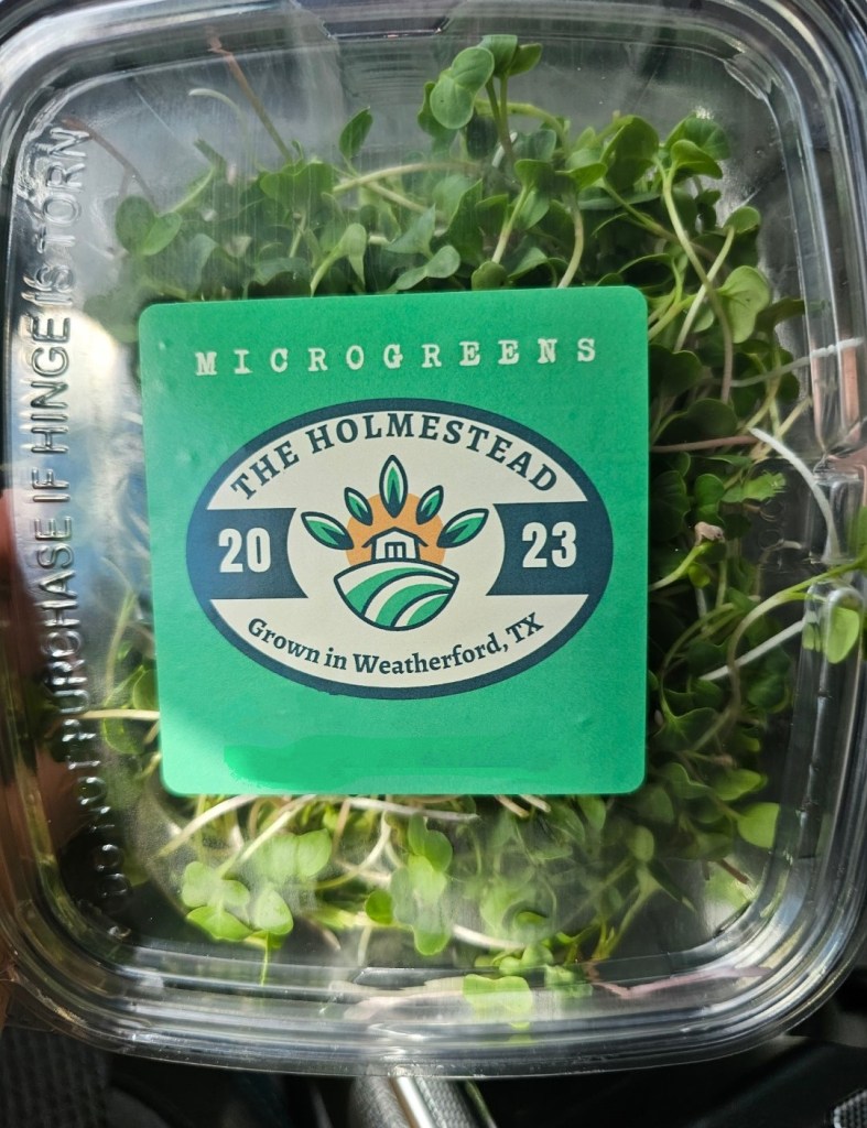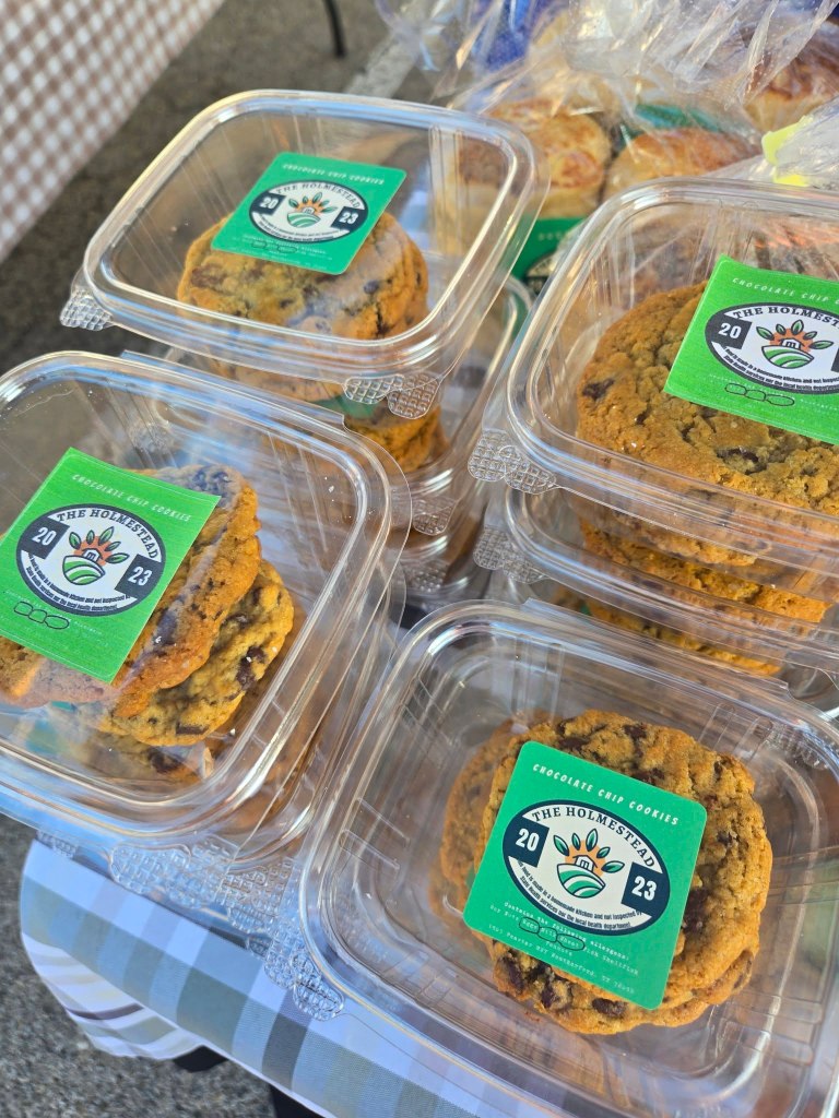 The Holmestead produces year-round chicken eggs, microgreens, and sourdough baked goods, in addition to seasonal fruit, and pecans, with more produce and fresh cut flowers to come. Also participating in nutritional programs such as S/FMNP and SNAP.